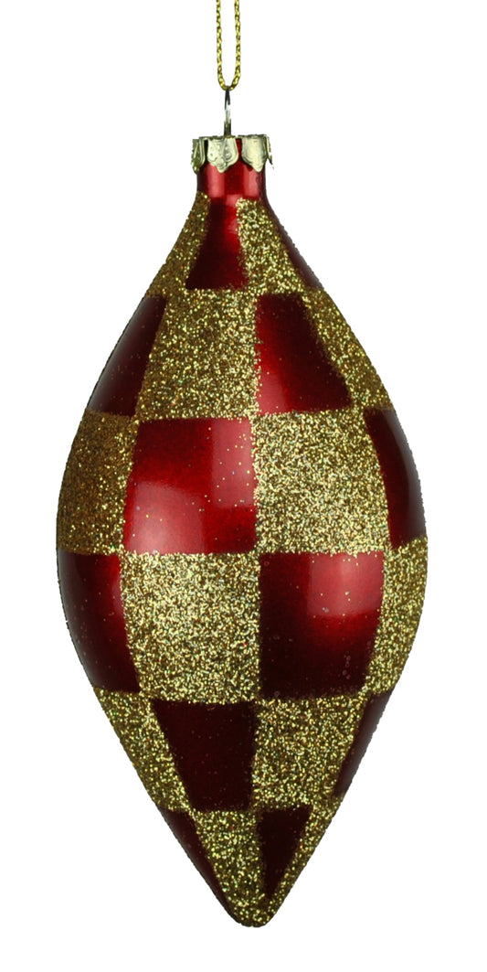 4 Pack of Red and Gold Checkered Teardrop Ornaments with Glitter Enhancements