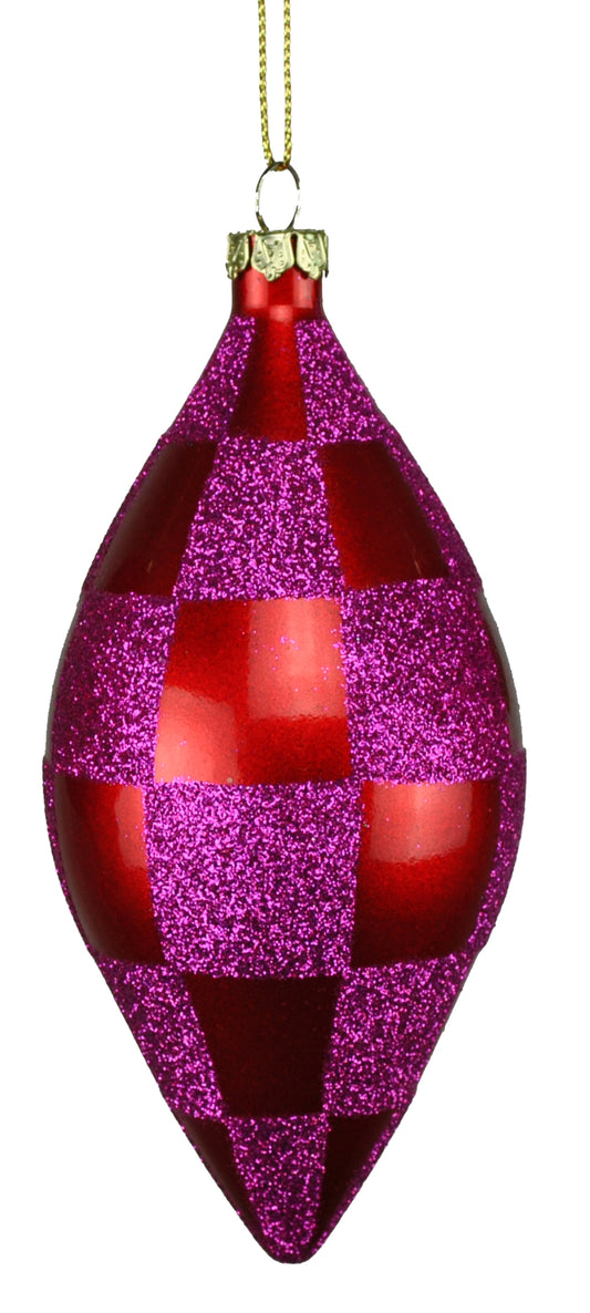 4 Pack or Red and Hot Pink Checkered Teardrop Ornaments with Glitter Enhancements