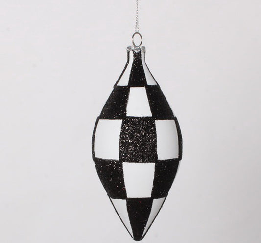 4 Pack of Black and White Checkered Teardrop Ornaments with Glitter Enhancements