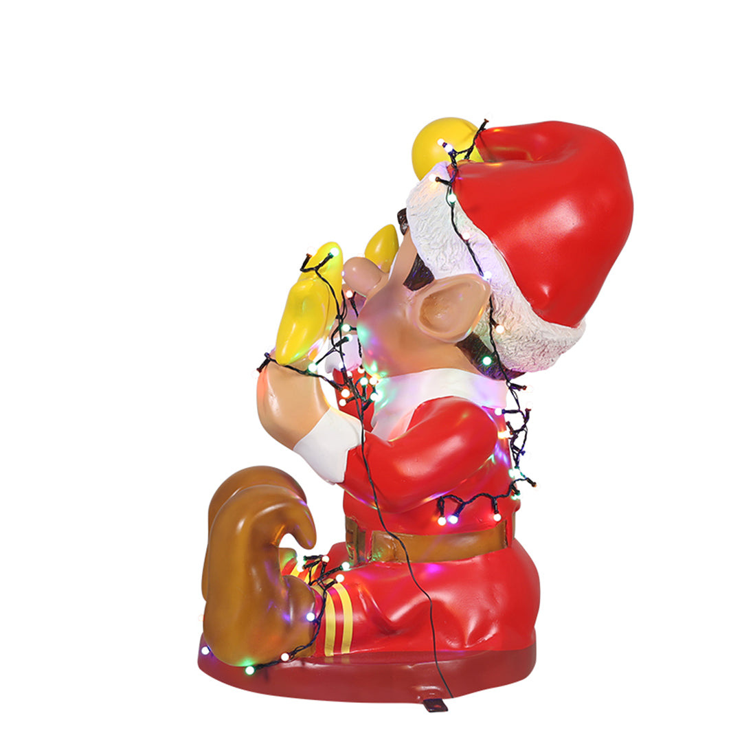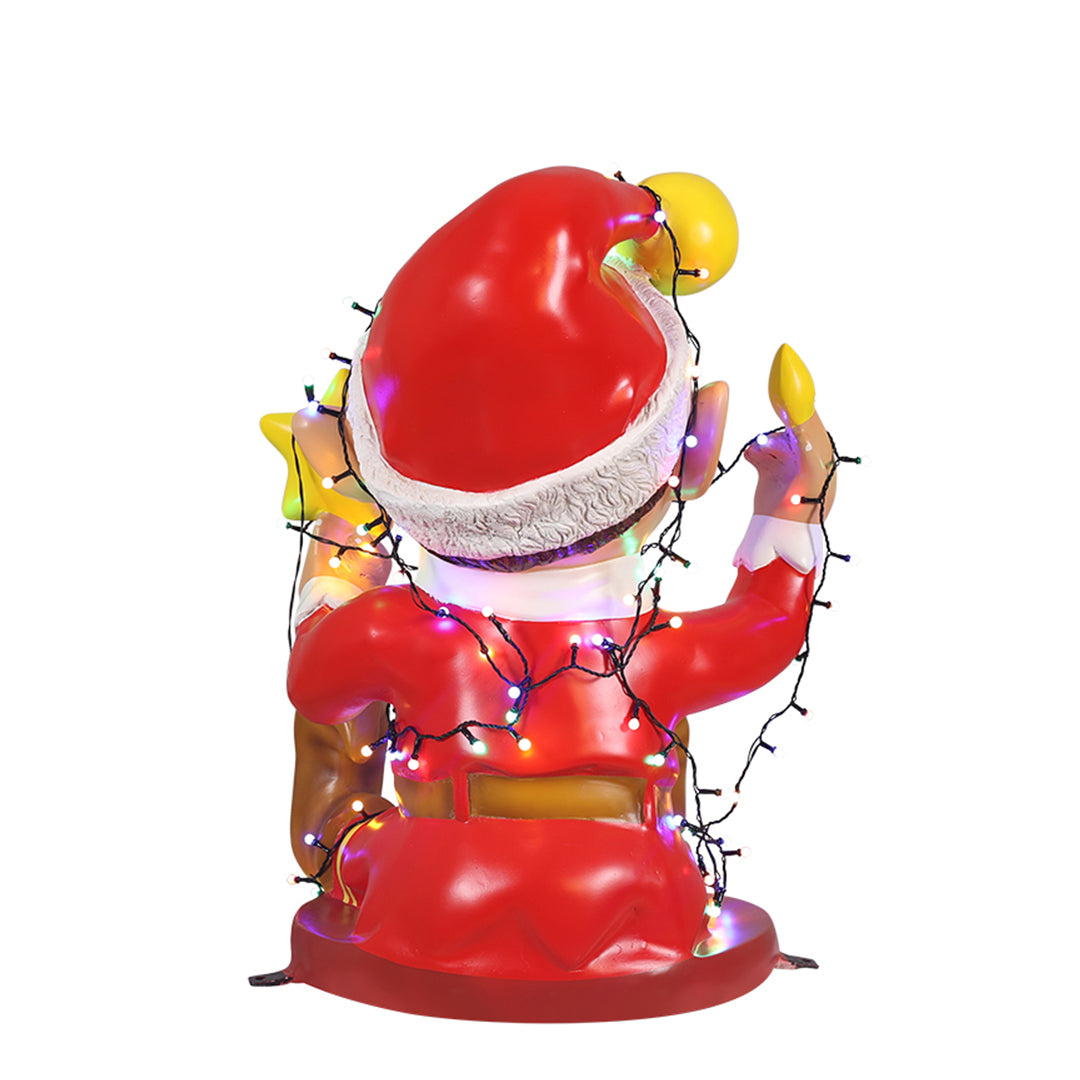 All tangled up in Christmas lights the decorating elf will cheerfully trim the trees. Sitting playfully in red attire, entangled in Multicolored lights that glow, ready to hand of the star