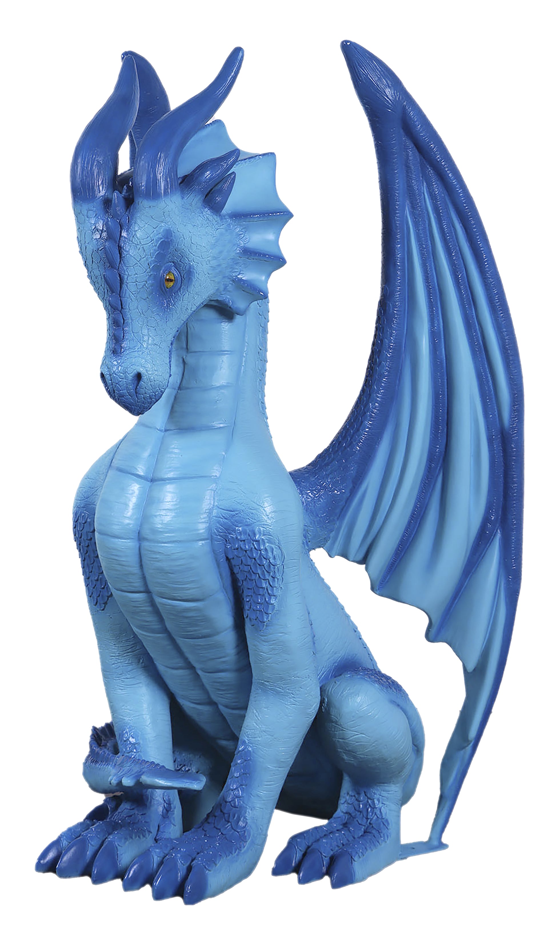 What an incredible creature! This 4' tall blue and teal dragon sits on it's back hunches with it's talk wrapped around itself in a comforting way. It's wings are rested in an upright stance and it's eyes are cast downward. His teal coat looks clean and polished with dark blue shading over his wings, horns, shoulders, and feet.