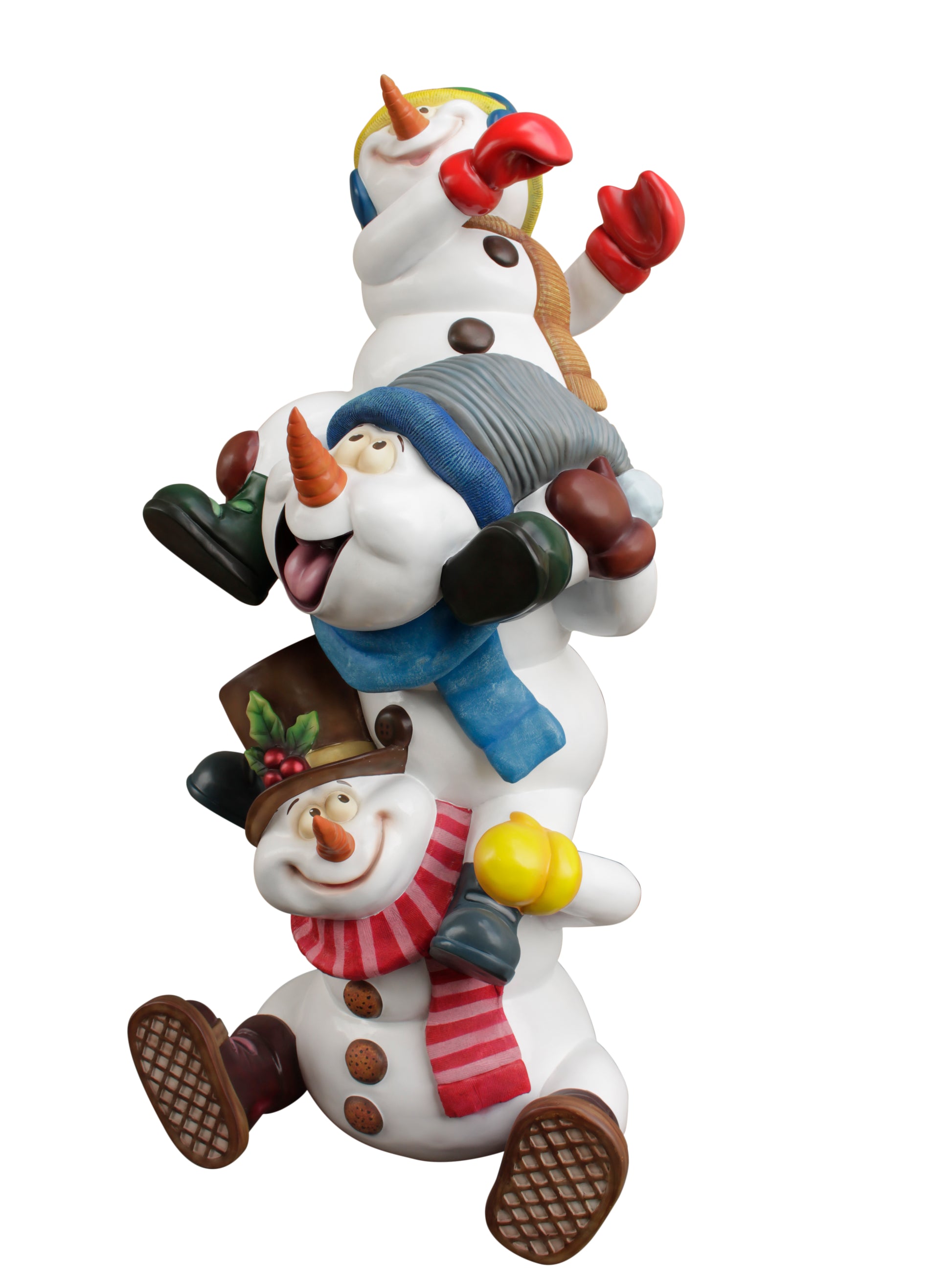 Run, don't walk, just like this trio of snowmen into winter festivities! These three snowmen stand at 6.5' tall together as they show off goofy joy for a snowy season. The snowman on the bottom wear's brown boots, three brown buttons up his middle, a red and white scarf and a brown hat with mistletoe pinned to its front. He carries his friend, who wears gray boots with a matching blue hat and scarf, on his shoulders. The third snowman rides the shoulders of the second with red gloves on his hands and a colorful hat on his head.