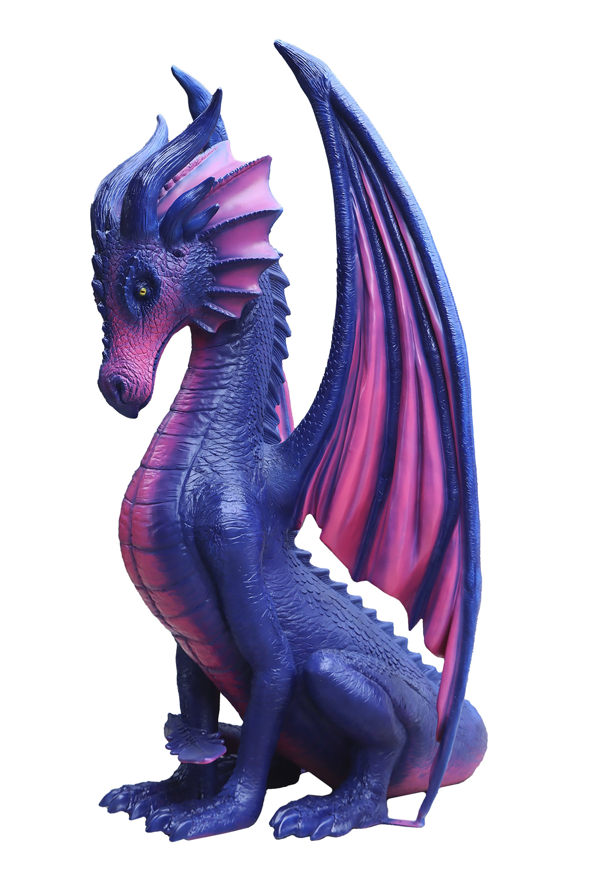 What an incredible creature! This 6' tall pink and purple dragon sits on it's back hunches with it's talk wrapped around itself in a comforting way. It's wings are rested in an upright stance and it's eyes are cast downward. His pink coat looks clean and polished with dark purple shading over his wings, horns, shoulders, and feet.