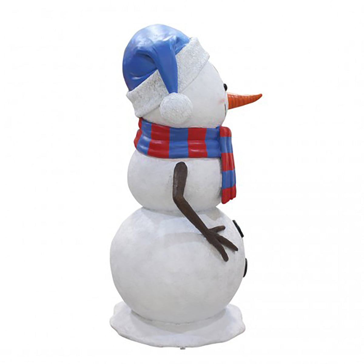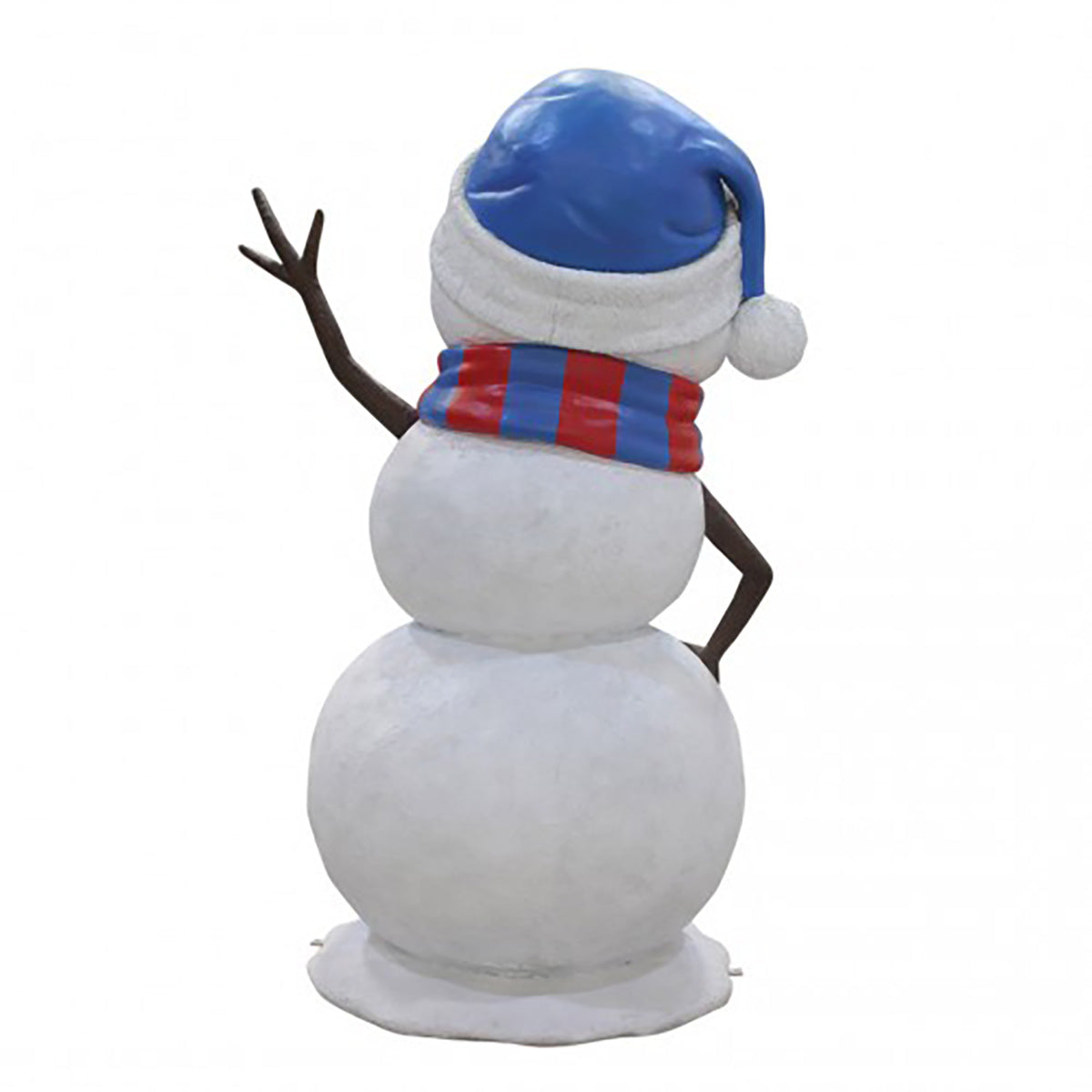 Standing at 8' tall, this snowmen are sure to be a larger-than-life hit for people of all ages! Snowman wears a royal blue Santa hat with a blue and red striped scarf wrapped around their necks. He has his left arm lifted in a welcome and the other popped on their hip.