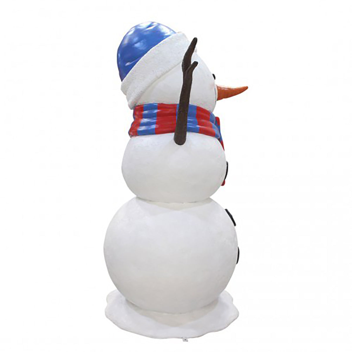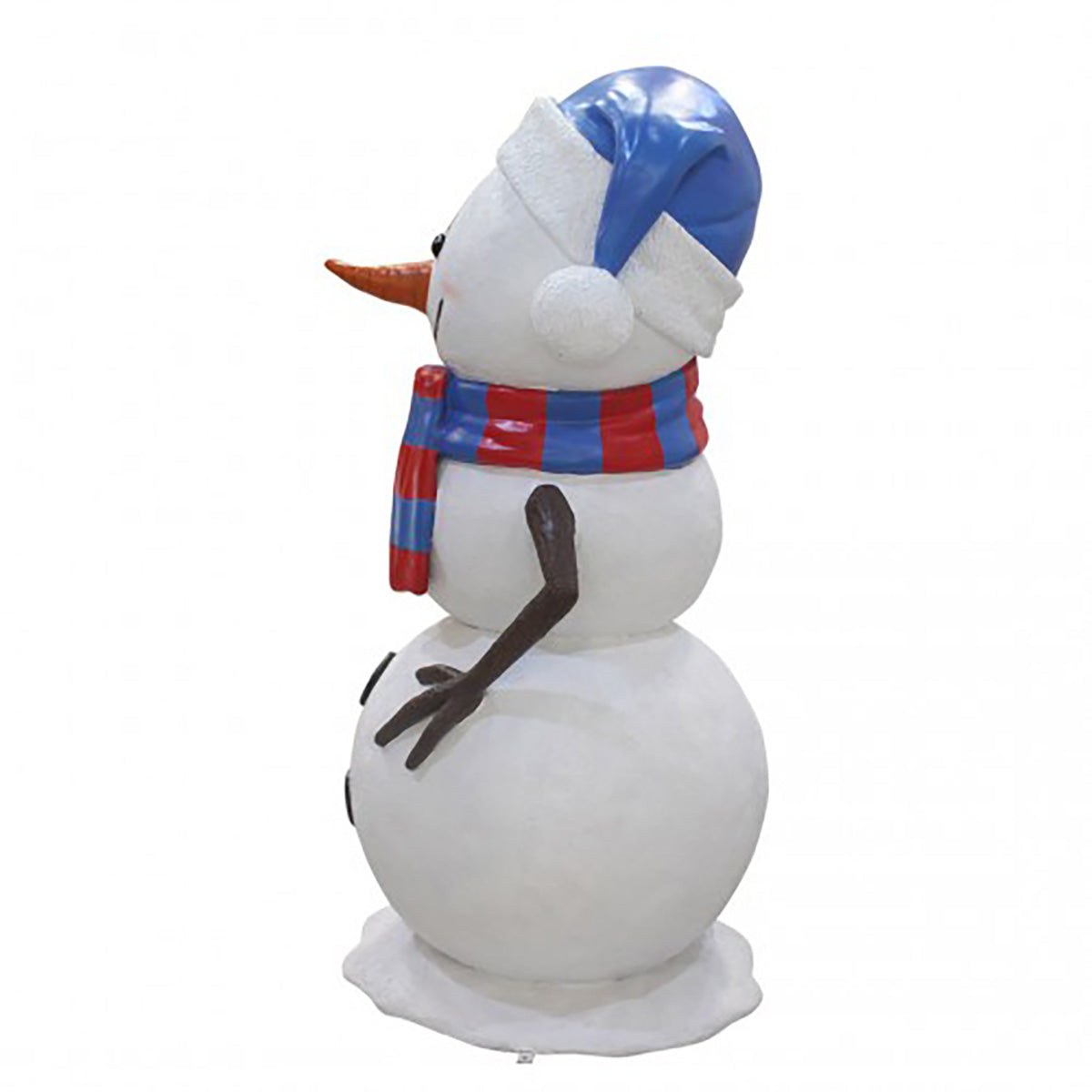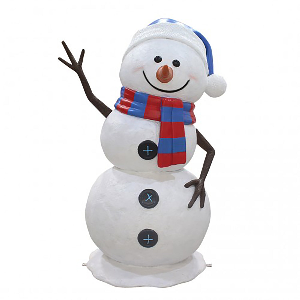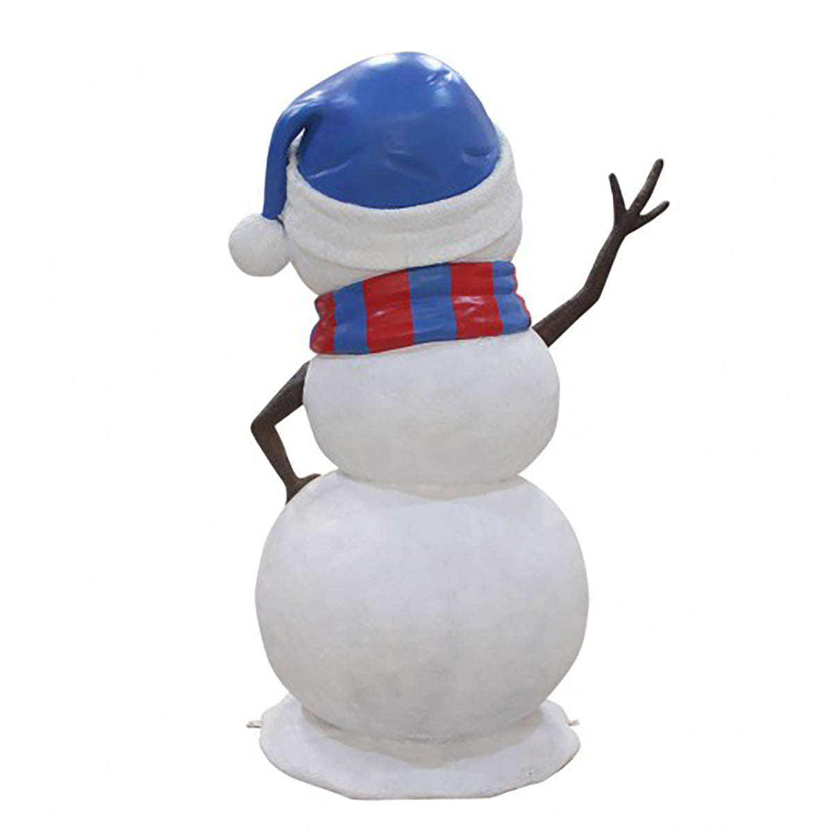 Standing at 8' tall, this snowmen are sure to be a larger-than-life hit for people of all ages! Snowman wears a royal blue Santa hat with a blue and red striped scarf wrapped around their necks. He has his right arm lifted in a welcome and the other popped on their hip.