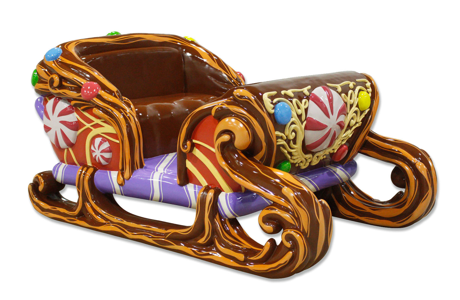 Glide through the world of confectioneries in the milk chocolate sleigh, coated in fanciful candies. The Caramel swirls create pattern and movement guiding to peppermint disk, yellow pippins and taffy striped floor.