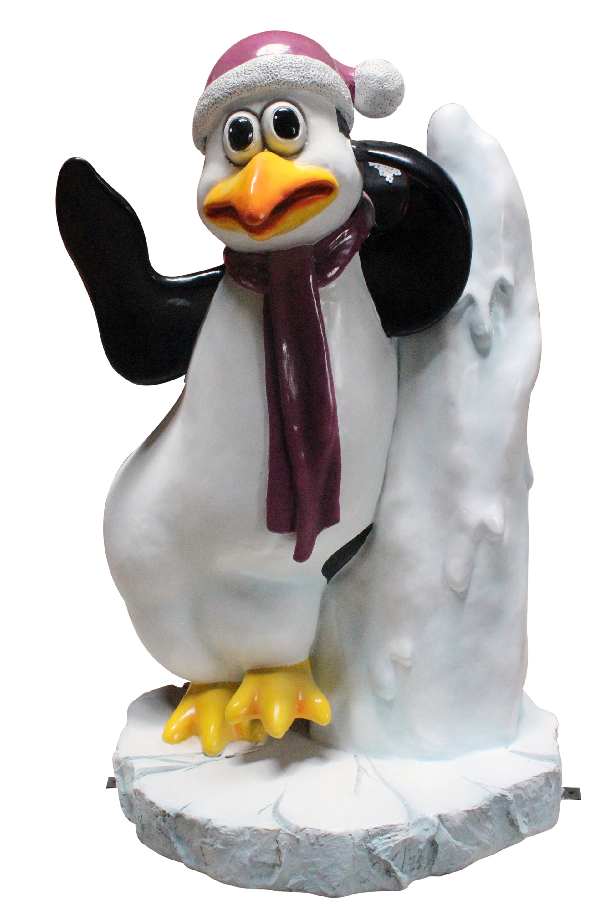This adorable, playful penguin comes complete with a purple hat and scarf. He is ready for this holiday season. Funny penguin stands approximately 4'.