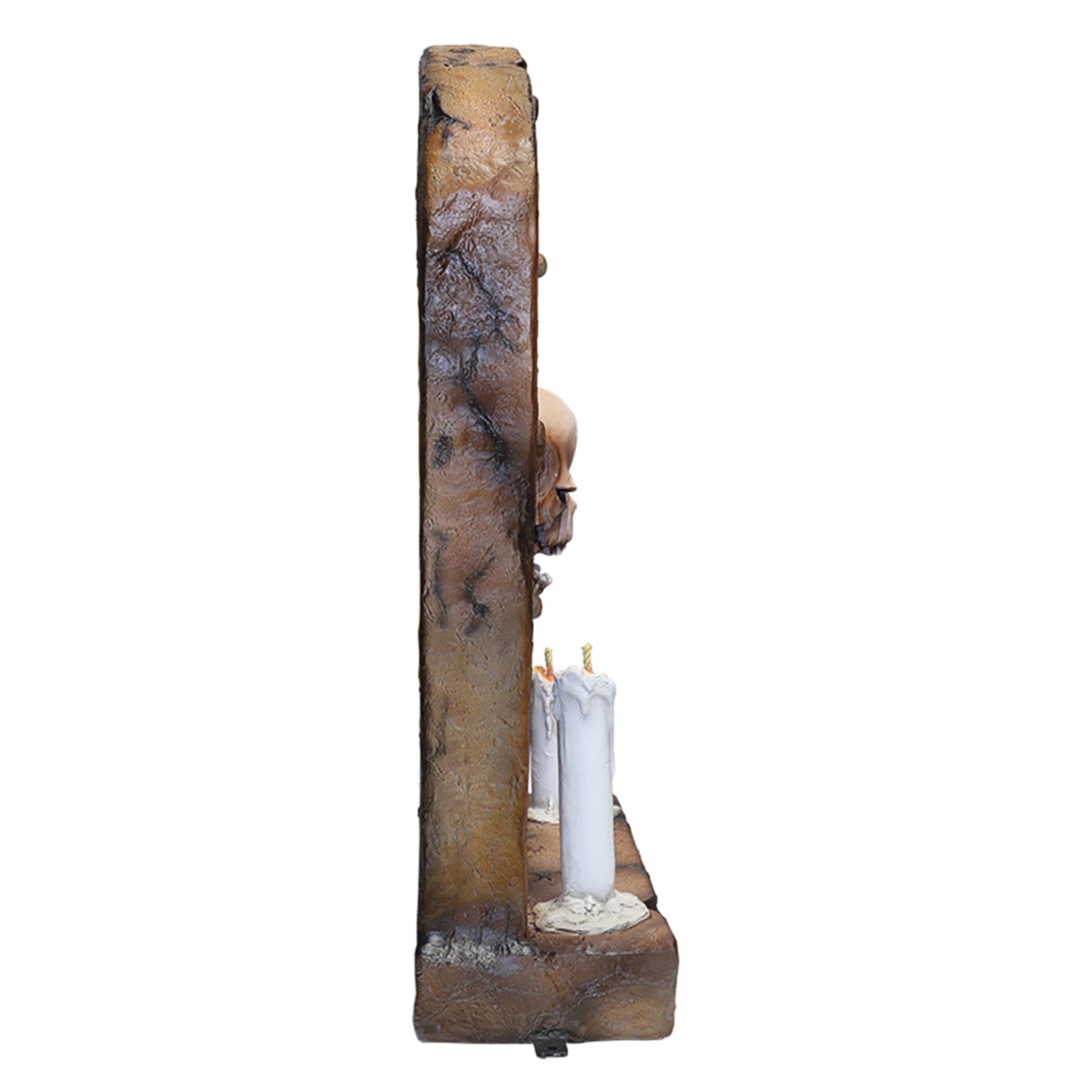 Step into the afterlife with this larger-than-life tombstone bearing the letters RIP. A skull protrudes from this 4' tall tombstone with two melted down candles at its base.