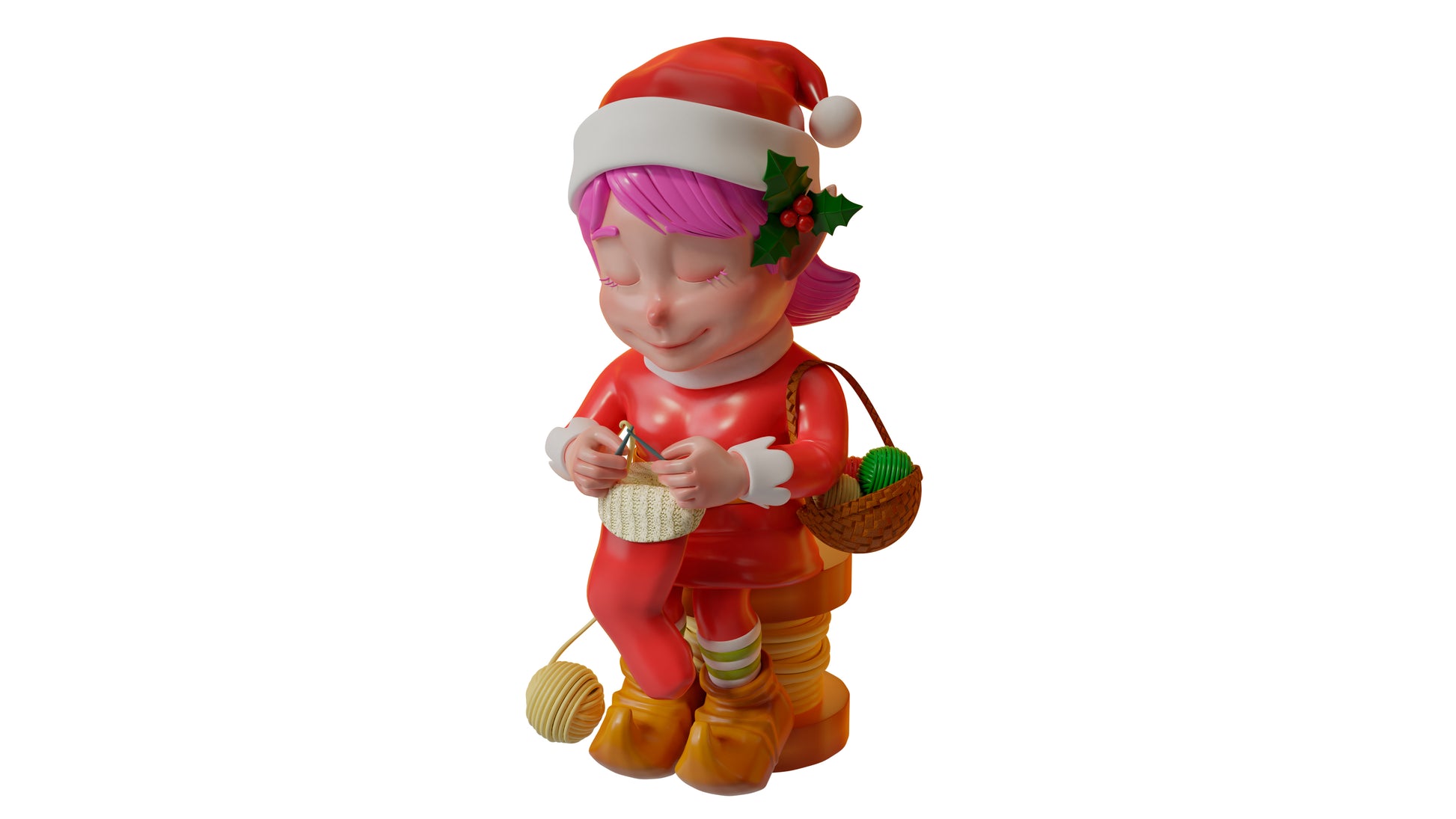 The duties of an elf are never ending- just look at this Red Elf Knitting. While her hat and outfit are a Christmas red and so is the stocking she's knitting last minute, her bright pink shares shows off her playful personality. She carries a wicker basket full of yarn, the green ropes peeking out, and she sits on a thimble of thread, sitting at 3' tall.