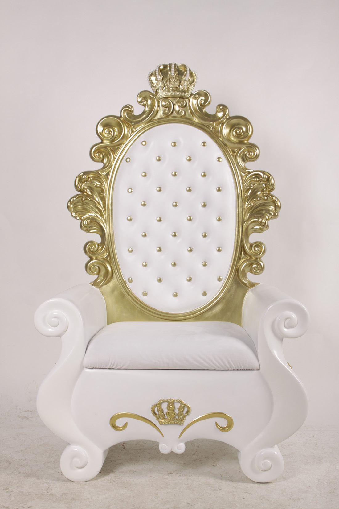 Sit in luxury in this stunning White and Gold Throne with a Kings Crown carved into the golden trim on top. While this chair stands at 5.5' tall from legs to the top of the crown, its seat is easily accessible for people of all heights. Sink into the plush white cushions and notice the way the sleek white arms and legs shine against the golden details. With a gold back sporting all kinds of details, it's easy to miss the kings crown perched at the top that matches the one embedded in the base of the chair as well.